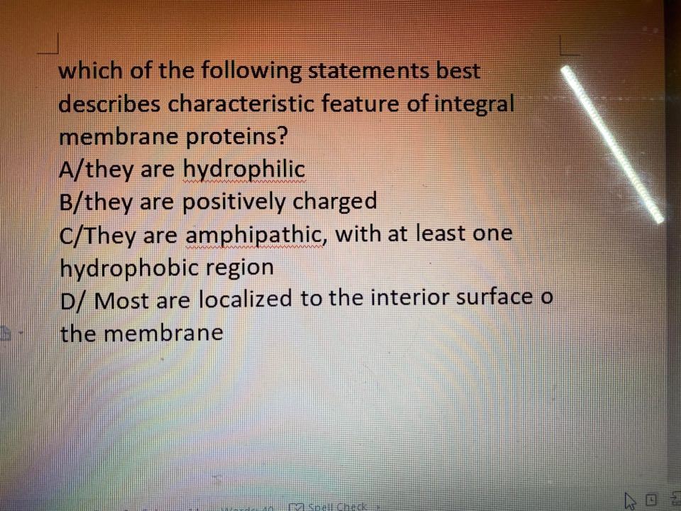 1 Which of the following statements best describes a characteristic feature of integral membrane proteins. A The animal cell is in a hypotonic. B They are hydrophobic.